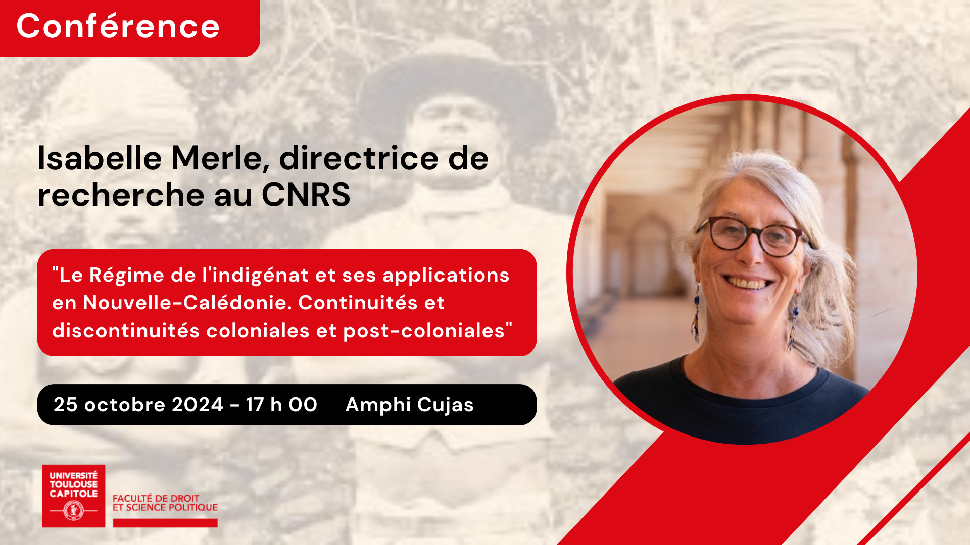 La Faculté de droit de Toulouse a le plaisir d'accueillir le 25 octobre prochain Isabelle Merle, Directrice de recherche au CNRS, historienne de la colonisation et spécialiste de l’histoire du Pacifique et plus particulièrement de la Nouvelle-Calédonie, pour une conférence exceptionnelle sur "Le Régime de l'indigénat et ses applications en Nouvelle-Calédonie : Continuités et discontinuités coloniales et postcoloniales.