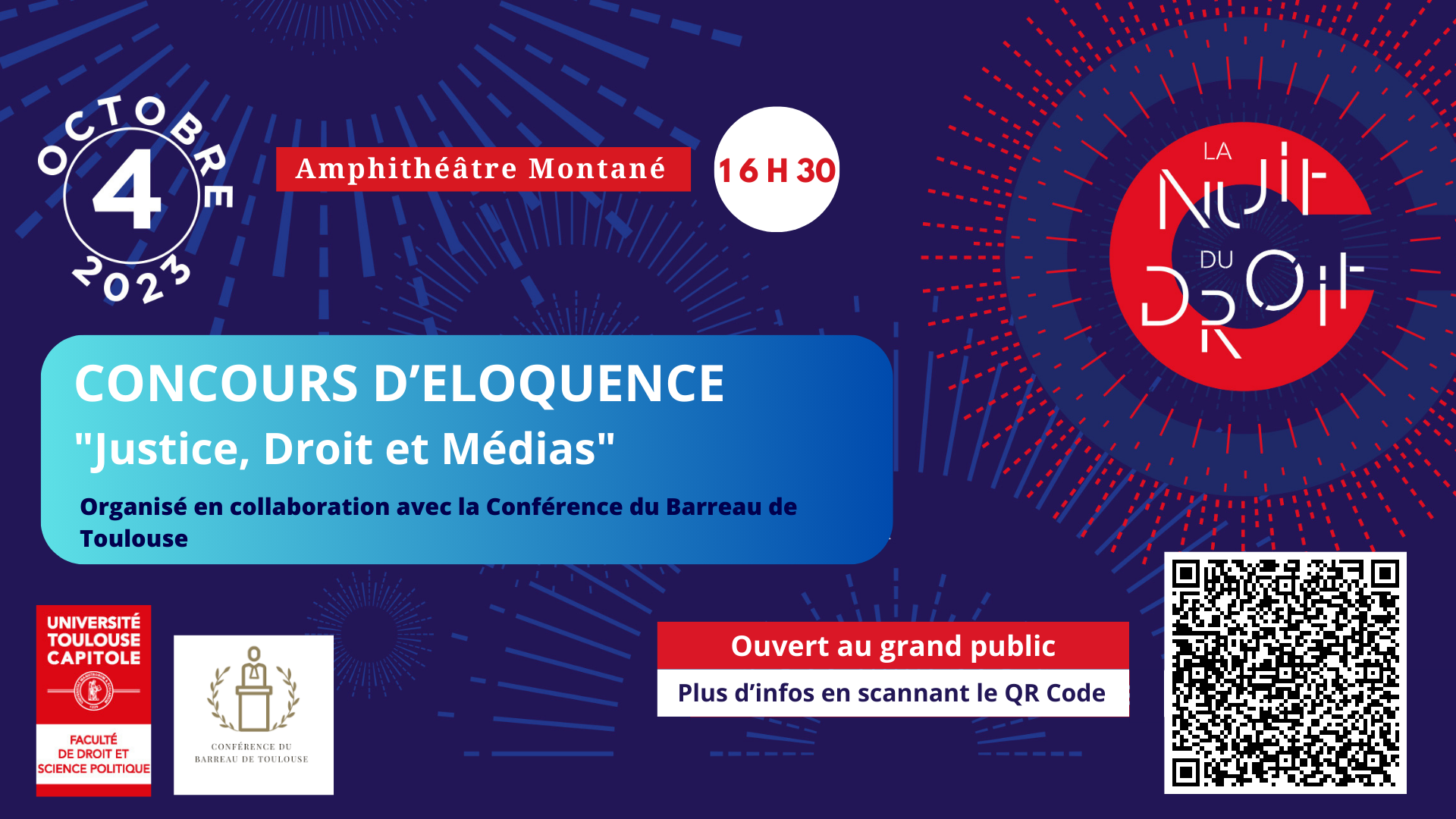 À l’occasion de la Nuit du Droit, la Faculté de droit et science politique organise, en collaboration avec la Conférence du barreau de Toulouse, un concours d'éloquence sur le thème "Justice, Droit et Médias".
