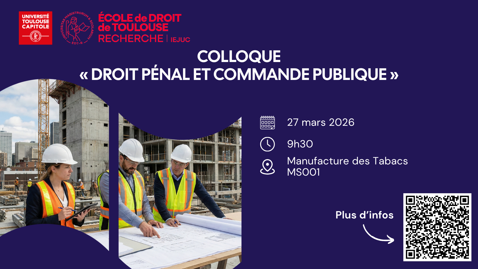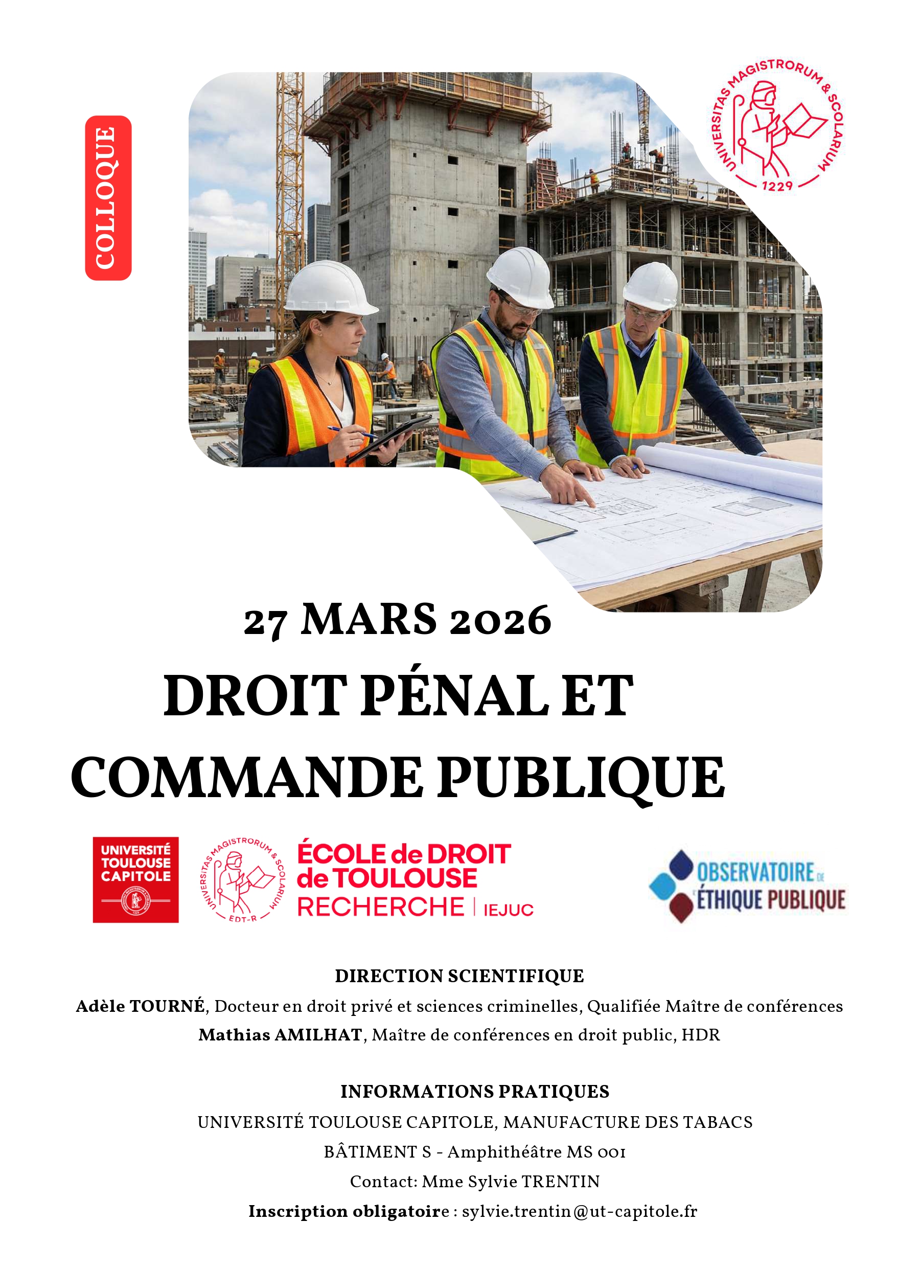 Co-organisé par Adèle Tourné et Mathais Amilhat, ce colloque a pour objectif de proposer une matinée théorique portant sur le droit pénal de la commande publique et un après-midi organisé autour d'une table ronde où seront évoqués des enjeux d'actualité, notamment avec des professionnels de la matière.