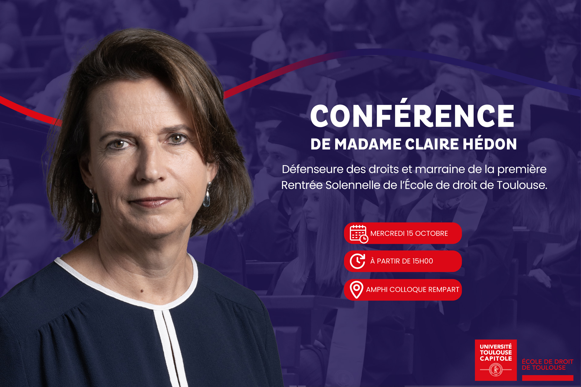 Dans le cadre de la Rentrée Solennelle de l'École de Droit de Toulouse qui se tiendra le mercredi 15 octobre 2025, Madame Claire Hédon, défenseure des droits animera une conférence sur le thème "Défendre les droits".