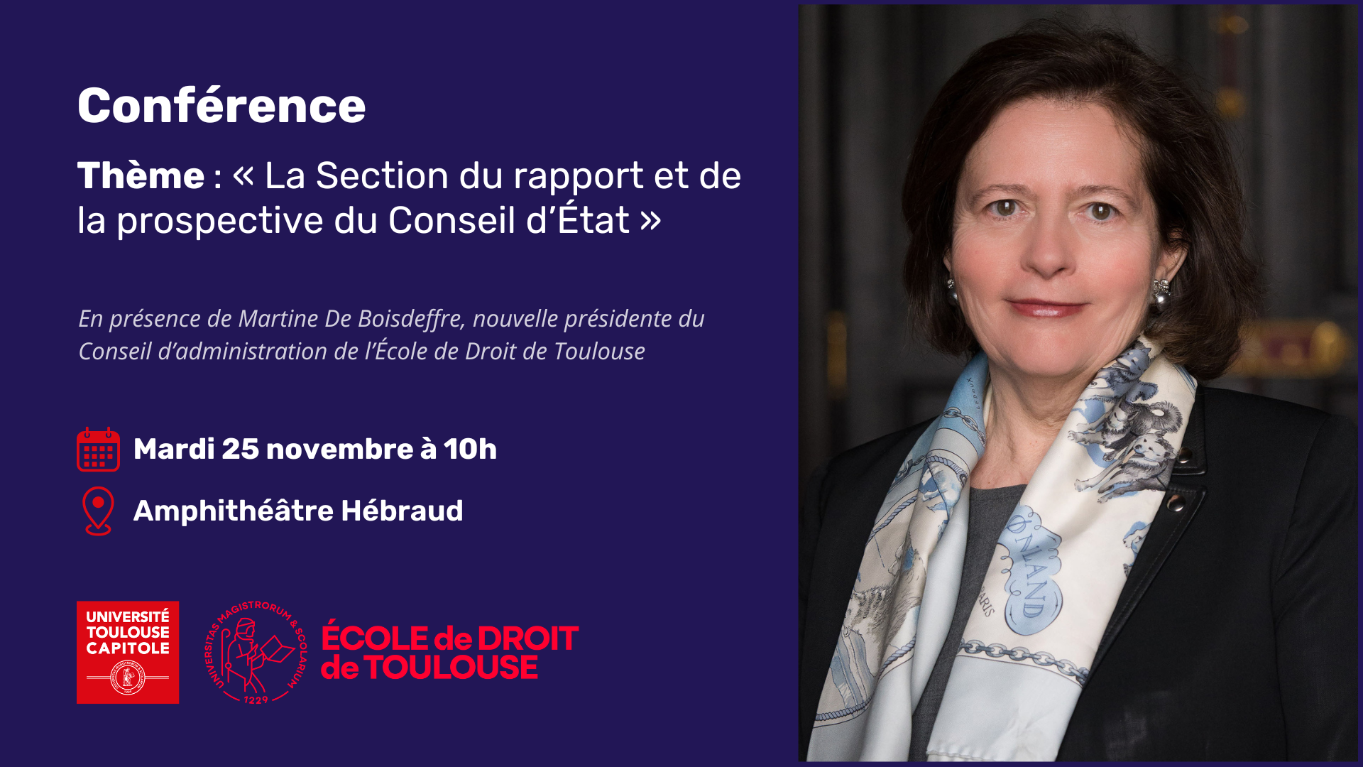 Madame Martine De Boisdeffre, Présidente honoraire de la Section des études, de la prospective et de la coopération du Conseil d’État, prononcera une conférence à l’École de Droit de Toulouse le mardi 25 novembre 2025.