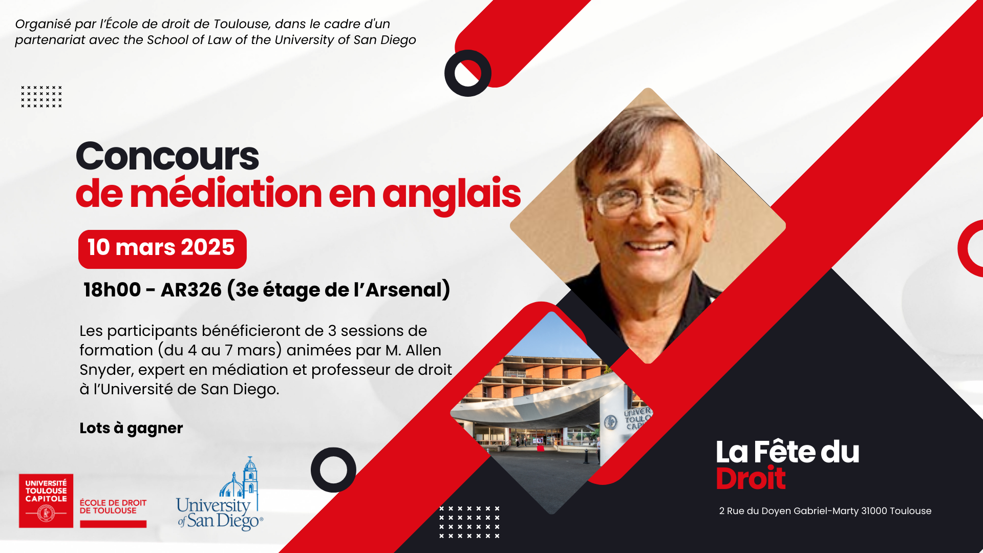 À l'occasion de la Fête du droit qui se déroulera du 5 au 11 mars 2025, l'École de droit de Toulouse organise un évènement étudiant de médiation en anglais, une expérience exceptionnelle à portée internationale.