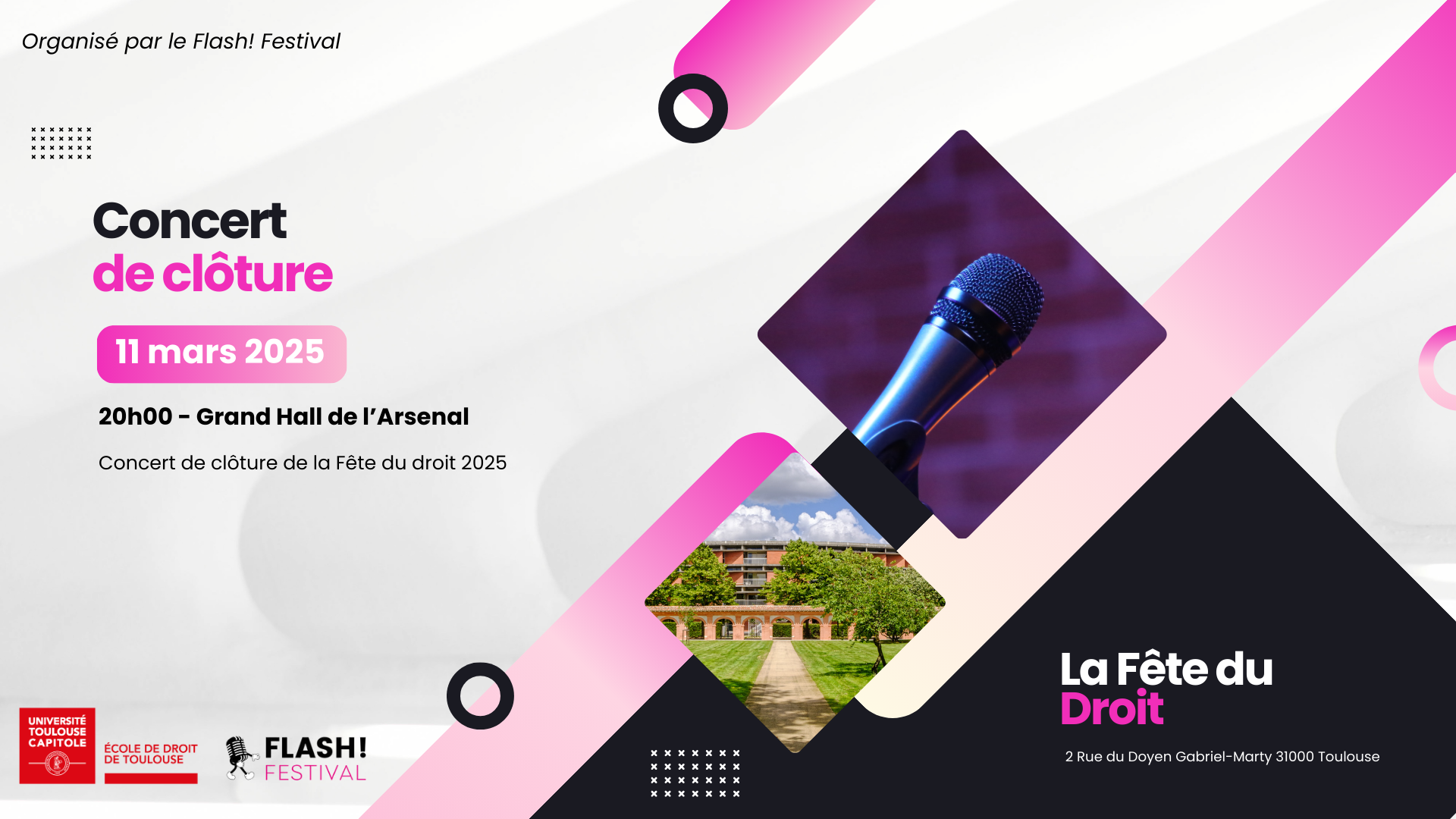 Le 11 mars 2025, le Flash! Festival sera à l'École de droit de Toulouse pour clôturer la Fête du droit ! Soyez au rendez-vous.