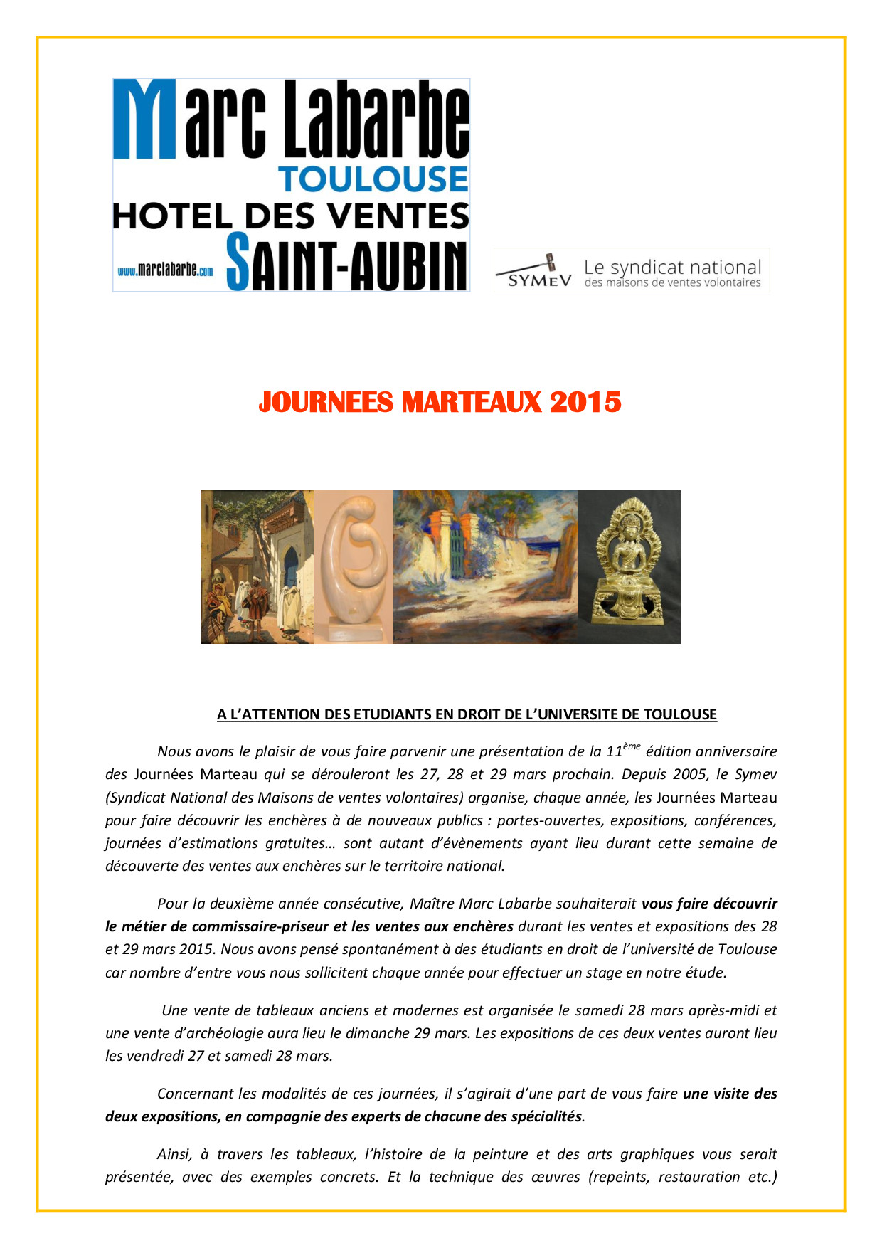 A l'occasion de la 11ème édition des Journées Marteaux qui se dérouleront les 27, 28 et 29 mars prochain, Maître Marc Labarbe vous propose de découvrir le métier de commissaire-priseur et les ventes aux enchères durant les ventes et expositions des 28 et 29 mars 2015.