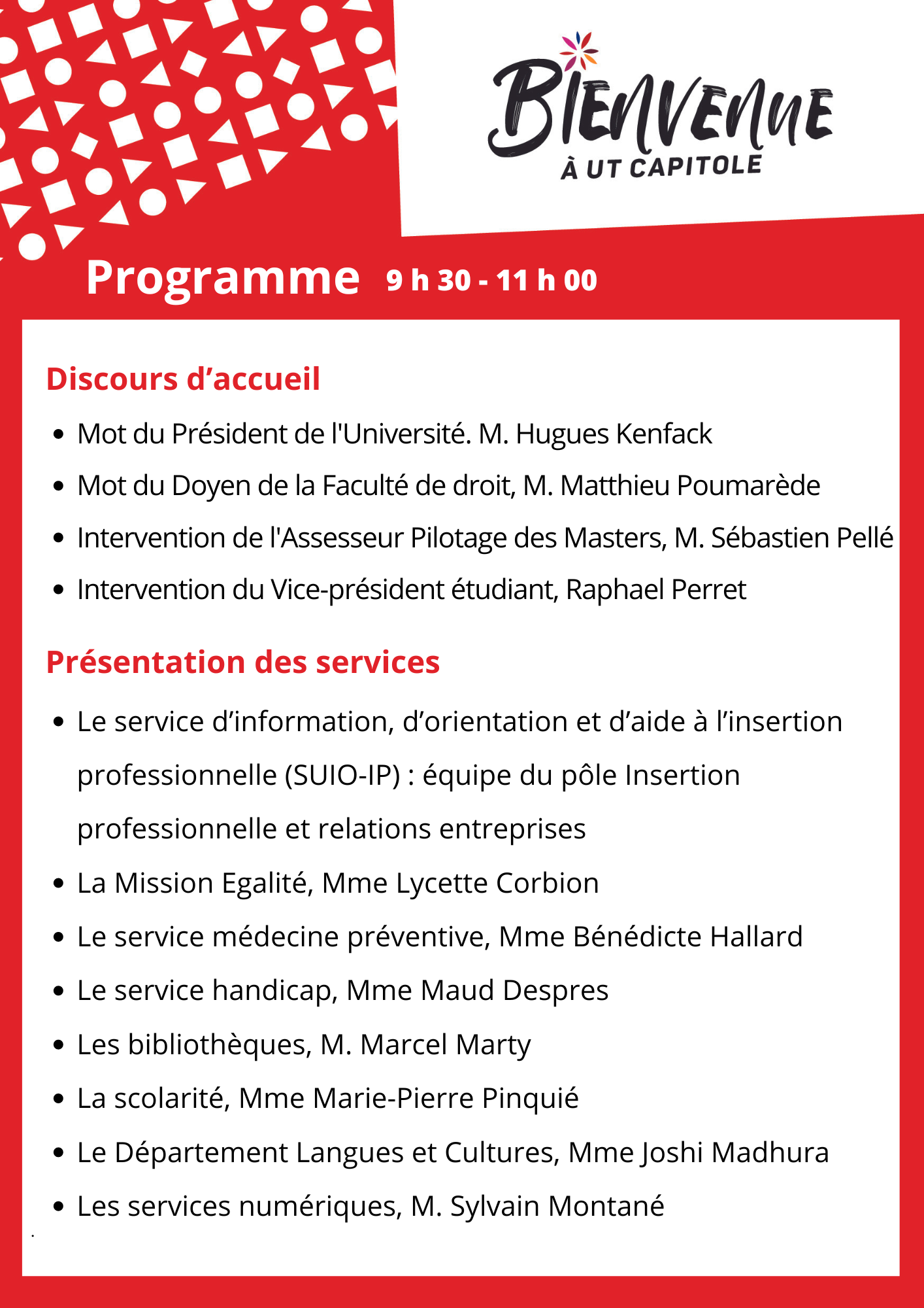 Vous intégrez la Faculté de droit de l'Université Toulouse Capitole en Master de droit à la rentrée 2024-2025 ? Une réunion de pré-rentrée vous est dédiée le vendredi 6 septembre en amphi Mestre.