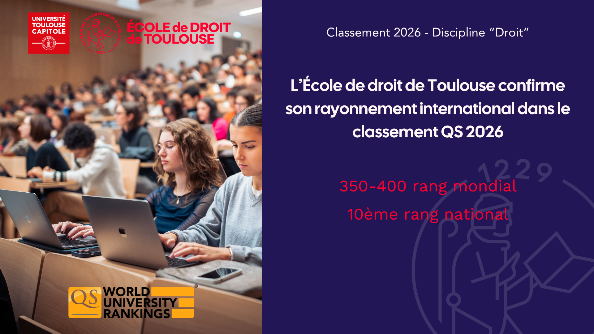 Pour la troisième année consécutive, l’École de droit de Toulouse, composante de Université Toulouse Capitole, figure dans le prestigieux classement QS World University Rankings par discipline pour l’année 2026.