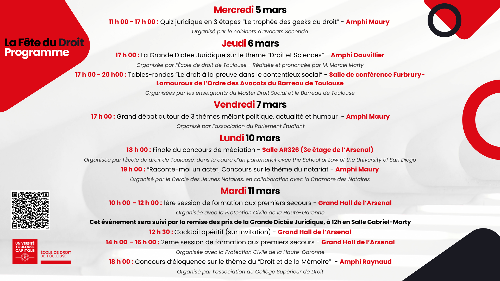 L'École de droit de Toulouse organise du 5 au 11 mars une série de manifestations pour fêter le Droit. Concours de plaidoirie, Grande dictée juridique, tables-rondes, quiz juridique, concert… Un programme riche et varié rythmera, pendant une semaine, la vie de l'École.