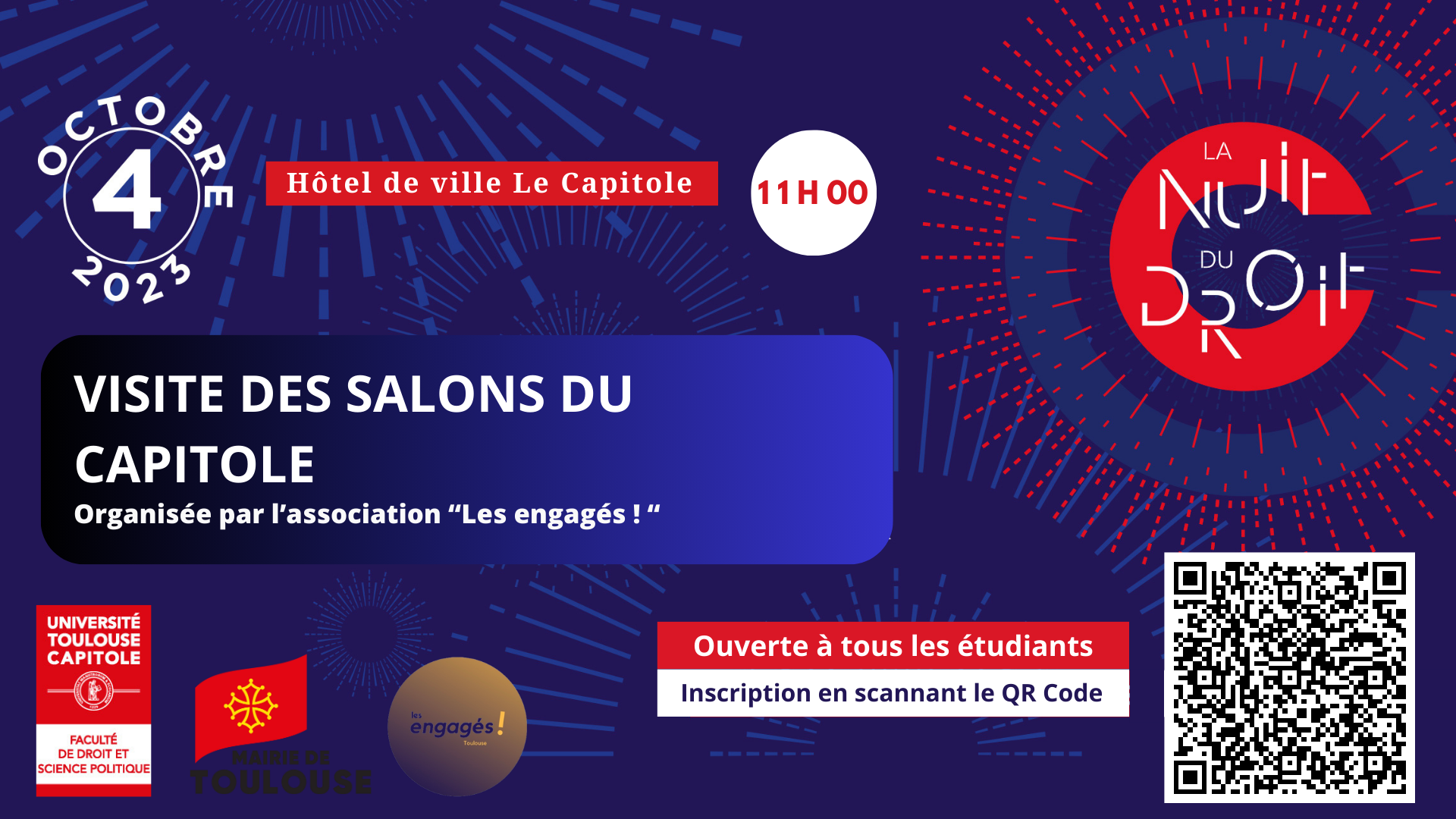 Dans le cadre de la Nuit du Droit 2023 organisée à la Faculté de droit de Toulouse le 4 octobre prochain, l'association étudiante Les engagés! organise une visite des Salons du Capitole en compagnie d'un élu local. Cette visite est ouverte à l'ensemble des étudiants de la Faculté de droit. Sur inscription.