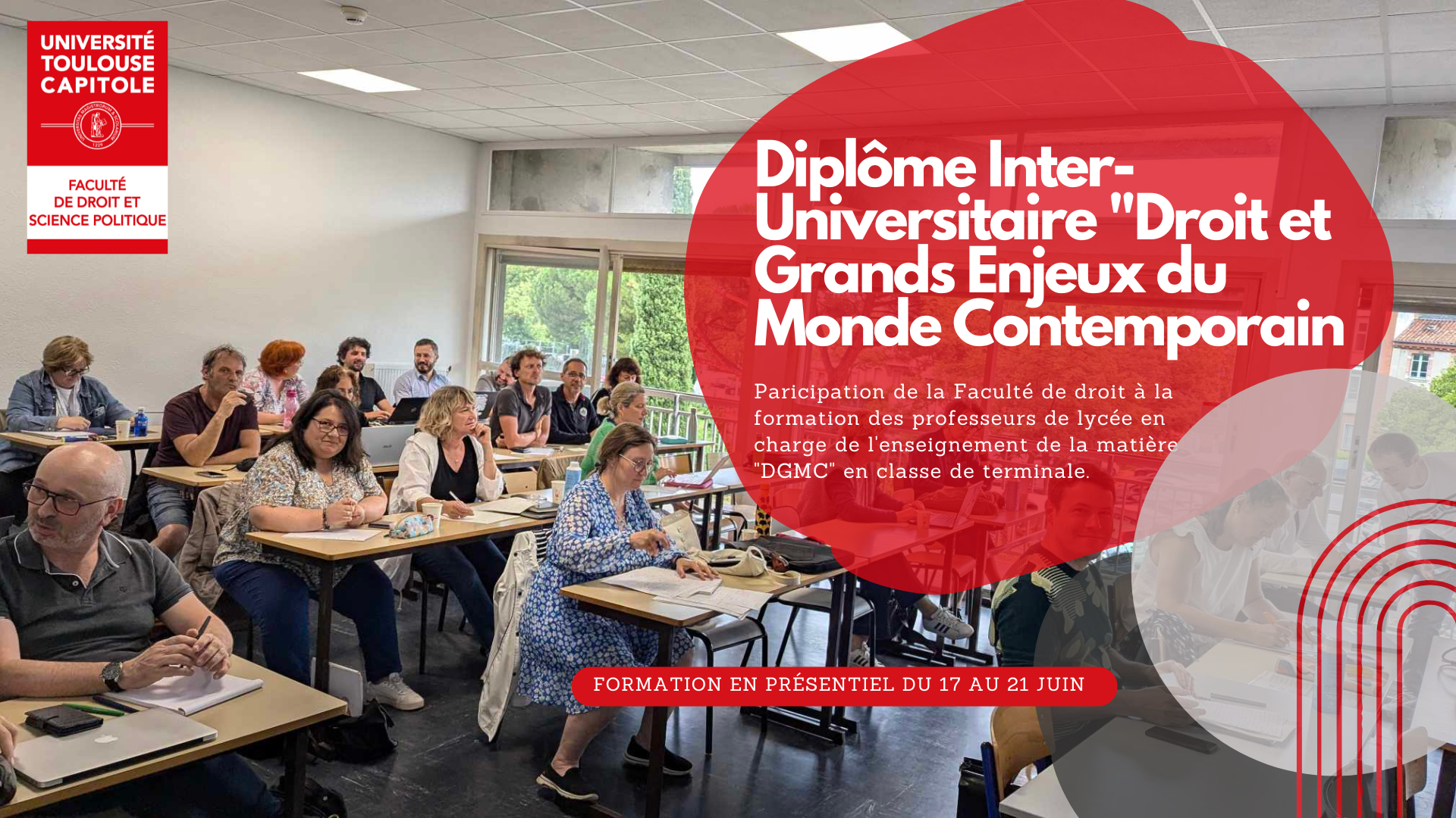 Du 17 au 21 juin 2024, la Faculté de Droit de l'Université Toulouse Capitole a accueilli des professeurs de classe terminale pour une formation en présentiel sur le thème "Droit et Grands Enjeux du Monde Contemporain", en vue de l'obtention du Diplôme Inter-Universitaire (DIU) DGMC.