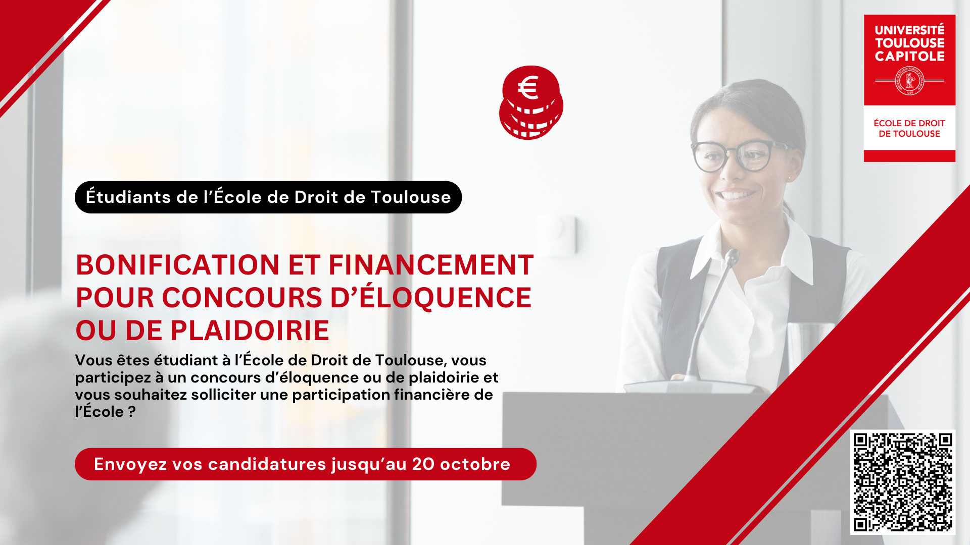 L'École de Droit de Toulouse donne la possibilité de bonification et de financement aux étudiants qui participent à des concours de plaidoirie et d'éloquence. La première commission de l’année universitaire 2025/2026, dédiée à l’attribution de la bonification, se déroulera au mois d’octobre.
