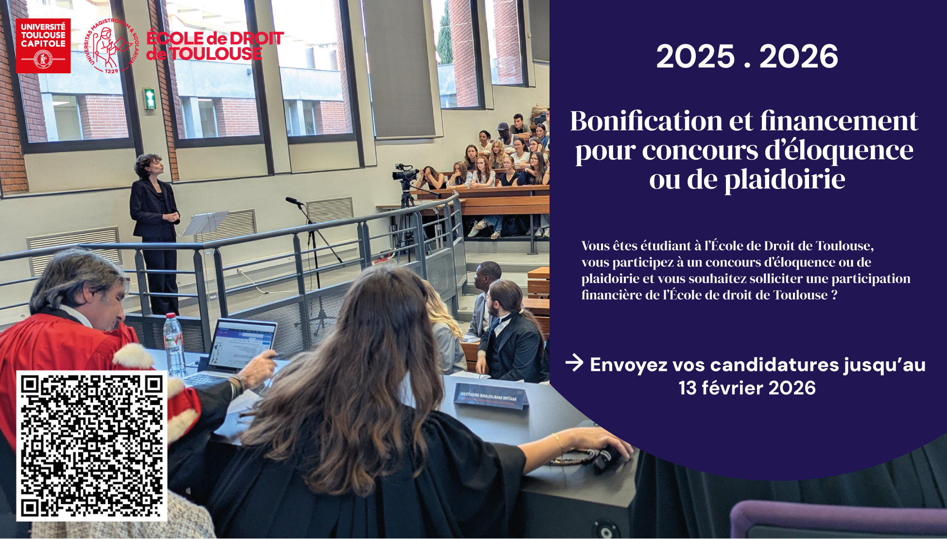 Pour l'année universitaire 2025-2026, l'École de droit de Toulouse donne la possibilité de bonification et de financement aux étudiants qui participent à des concours de plaidoirie et d'éloquence. La prochaine commission de financement aura lieu en février.
