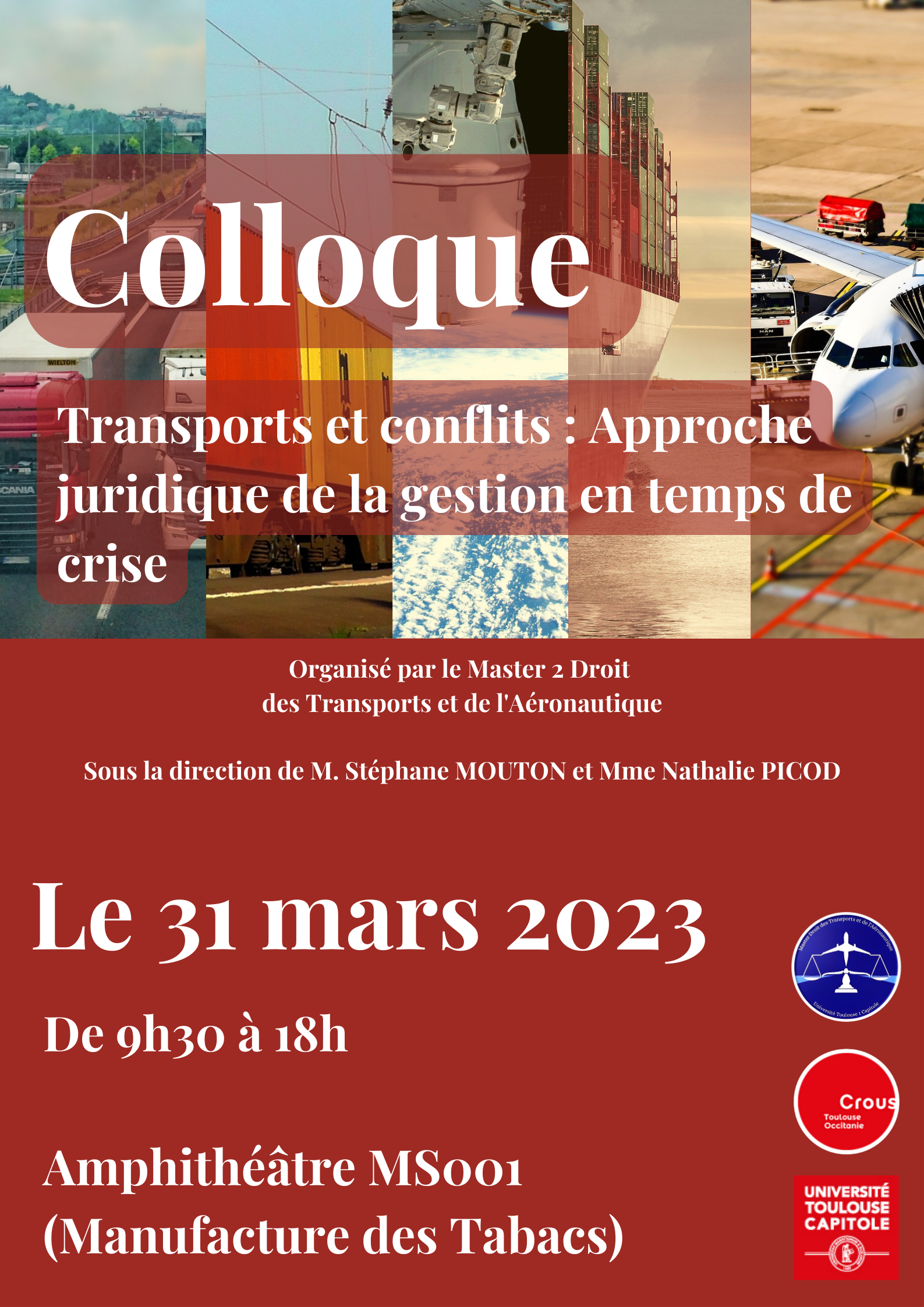 Organisé par les étudiants du Master 2 Droit des Transports et de l’Aéronautique, sous la co-direction de Mme Nathalie Picod et de M. Stéphane Mouton, ce colloque prendra la forme d'une série de tables rondes animées par divers spécialistes des milieux juridique et des transports.