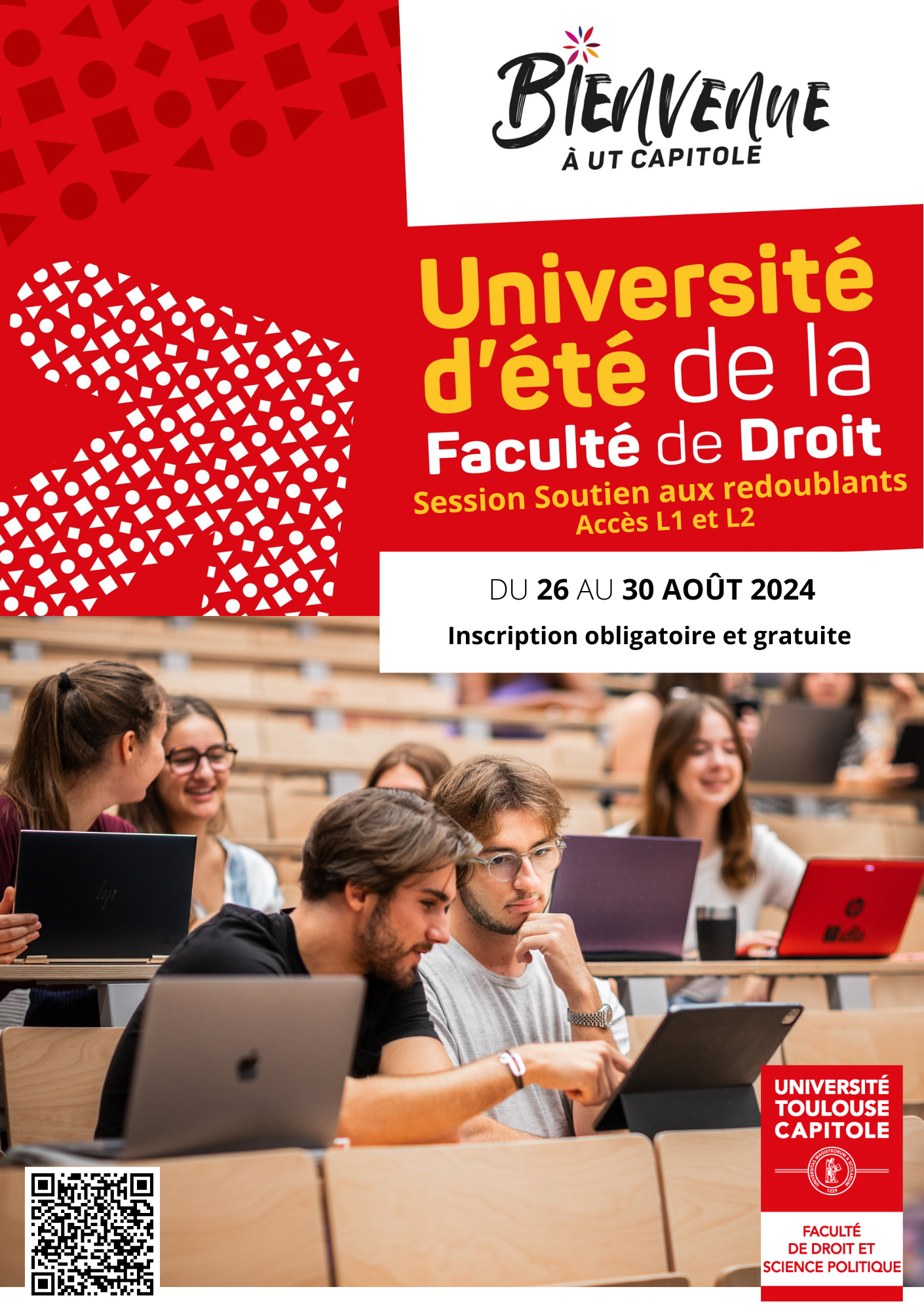 Depuis quelques années, la Faculté de droit organise, dans le cadre du Plan Réussite en Licence, plusieurs sessions d'Université d'été à destination des bacheliers et des étudiants. Une nouvelle session à destination des étudiants redoublants de la Faculté de droit sera mise en place à compter du 26 août 2024.